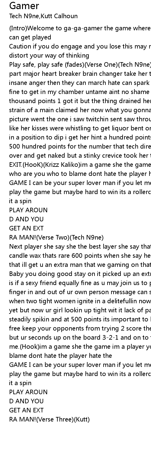 Play safe, play safe (fades)(Verse One)(Tech N9ne)i i am a game gamer play the part major heart breaker brain changer take her thoughts make her start they insane anger then they can march hate can spark names they (DANGER) you gotta be fine to get in my chamber untame aint no shame when i bang strangers but thats a thousand points 1 got it but the thing drained her in the game hanged her in the strain of a main claimed her now what you gonna do different wonder how will the picture went the one i saw twitchin sent saw through mommy like mr.kent lookin like her kisses were whistling to get liquor bent or wishin for me to stick her in a position to dip i get her hint a hundred points she gets cause we connected 500 hundred points for the number that tech direct texted bonus 300 if she come over and get naked but a stinky crevice took her to nothing girl take the |