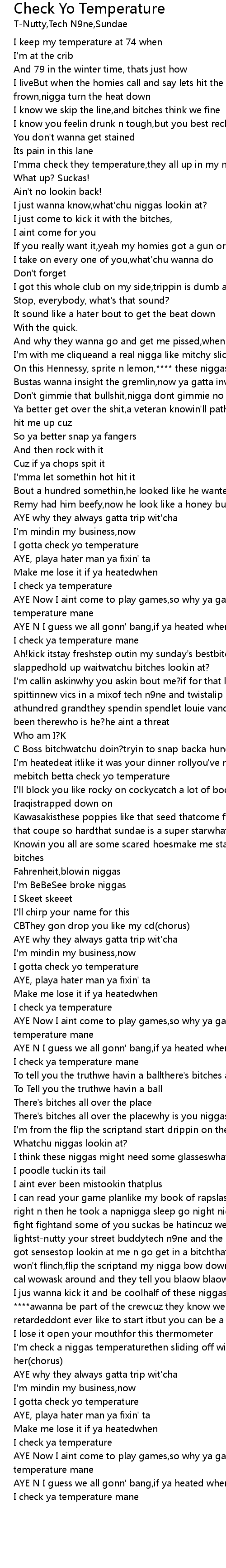 | I'm heatedeat itlike it was your dinner rollyou've never been a friend to mebitch betta check yo temperature | |