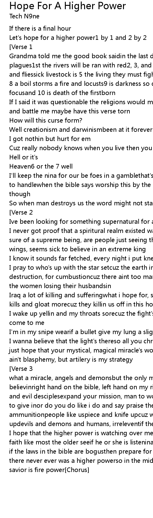 | I hope that the higher power is watching over mecuz we young people don't see faith like most the older seeif he or she is listenina mere sign can spark mebut if the laws in the bible are bogusthen prepare for anarchyworst case scenario is there never ever was a higher powerso in the midst of chaos nowthe only real savior is fire power[Chorus] |