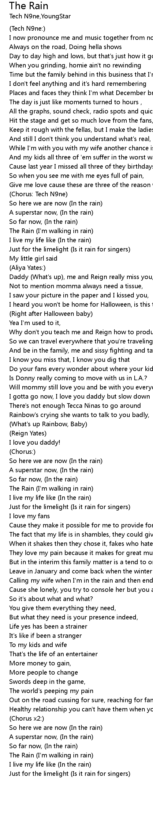 | Give me love cause these are three of the reason why I call the road 'the rain' | |