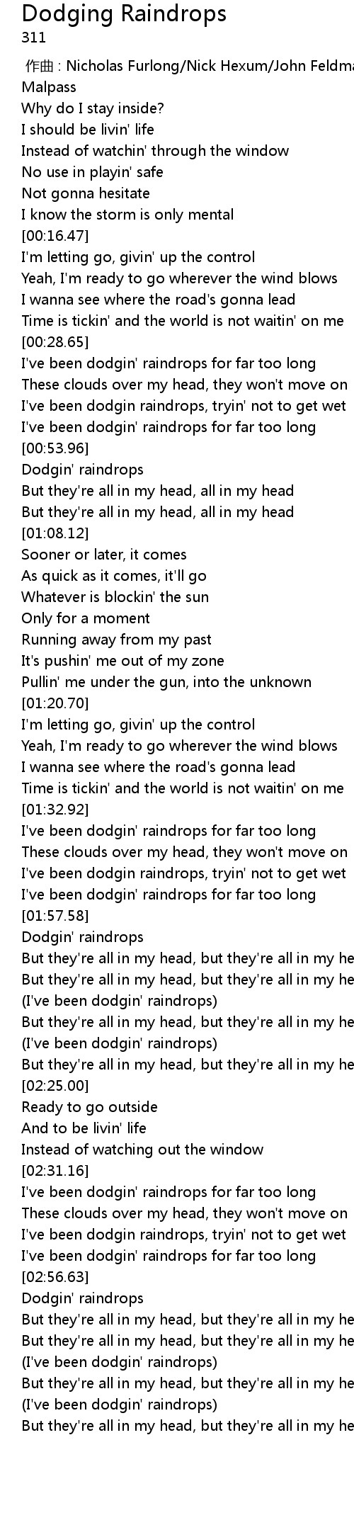 [03:11.81] (I've been dodgin' raindrops)