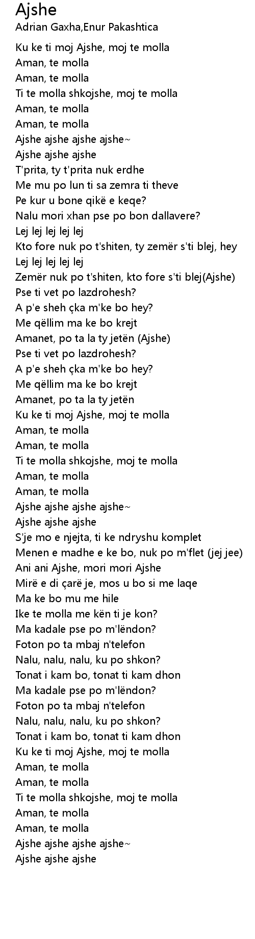 | [00:21.930] | Ku ke ti moj Ajshe, moj te molla |
