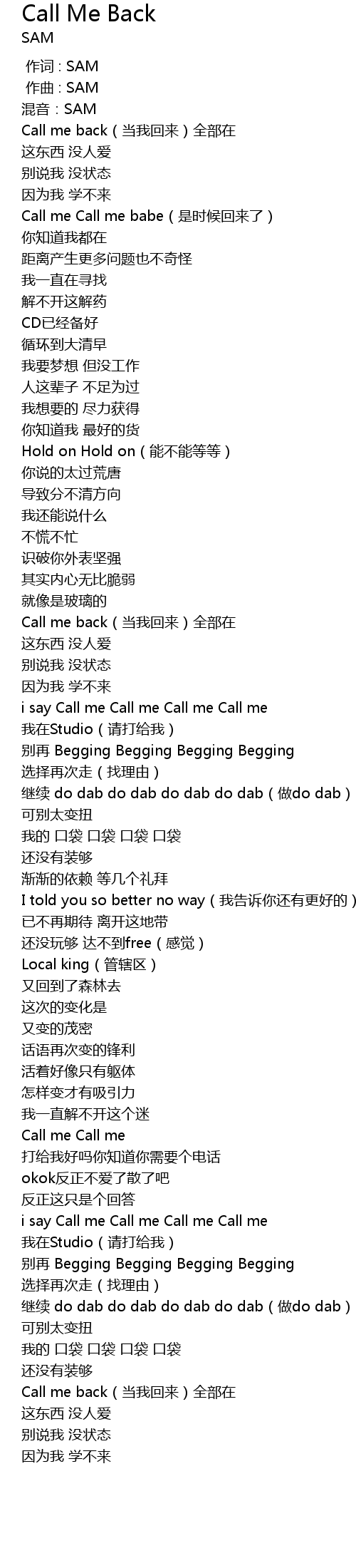 | [00:29.695] | Call me back dāng wǒ huí lái quán bù zài |