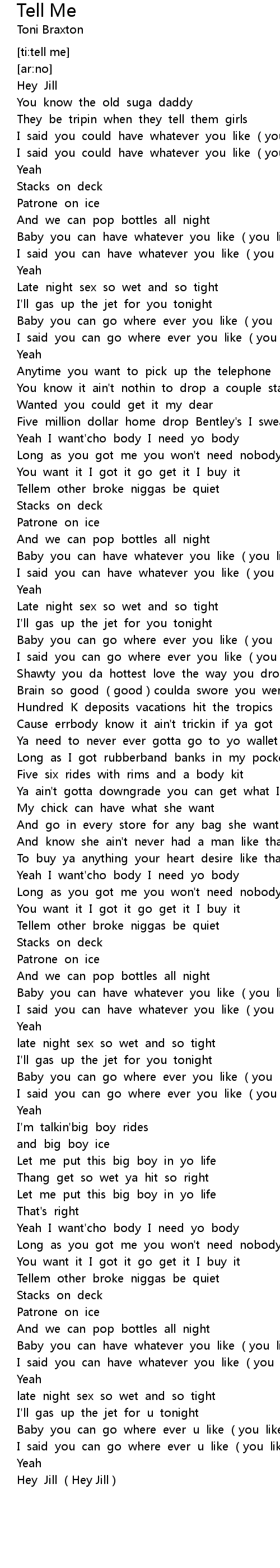 | [00:49.212] | Yeah I want' cho body I need yo body |