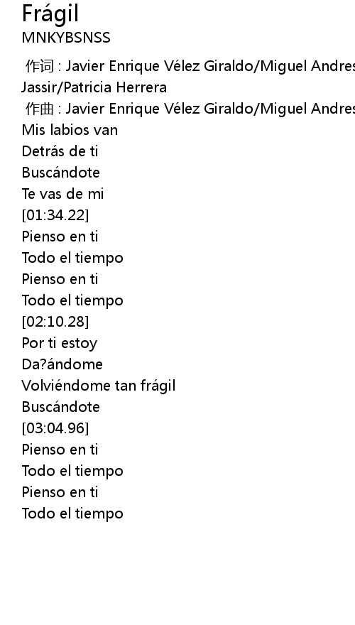 | [00:00.00] | 作词 : Javier Enrique Vélez Giraldo/Miguel Andres Urina Jassir/Patricia Herrera |