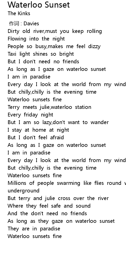 | [00:44.97] | As long as I gaze on waterloo sunset |
