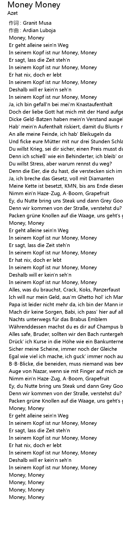 | [00:16.366] | In seinem Kopf ist nur Money, Money |