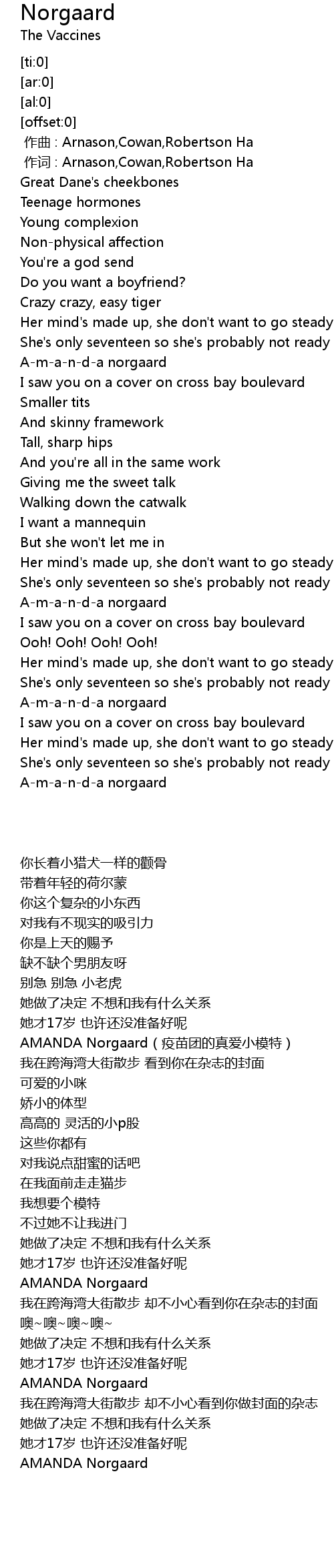 | [00:22.18] | AMANDA Norgaard(疫苗团的真爱小模特) |
