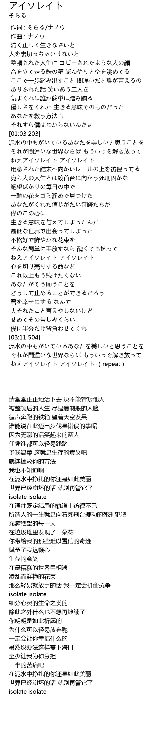 | [03:29.119] | ねえアイソレイト アイソレイト (repeat) |