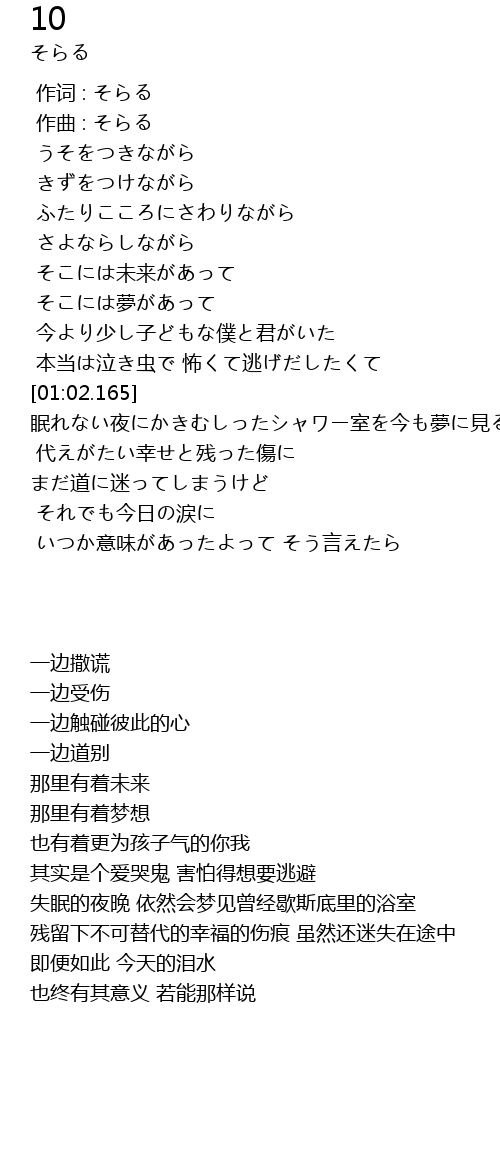 | [01:02.165] | 眠れない夜にかきむしったシャワー室を今も夢に見るよ |