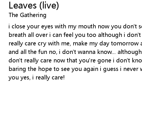 | i close your eyes with my mouth now you don't see anything but you feel my breath all over i can feel you too although i don't really know you i don't really care cry with me, make my day tomorrow all will be gone all the sweetness and all the fun no, i don't wanna know... although i don't really know you i don't really care now that you're gone i don't know how to really feel inside baring the hope to see you again i guess i never will now that i do really know you yes, i really care! |
