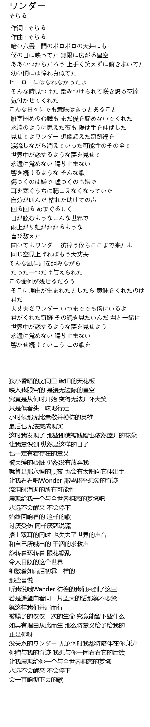 | [02:55.763] | 聞いてよワンダー 彷徨う僕らここまで来たよ |