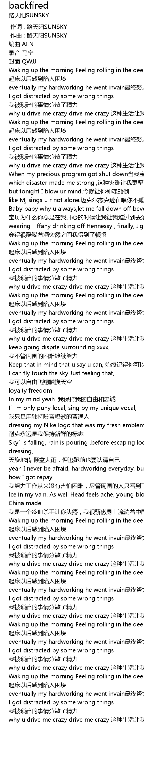 | [03:15.586] | Waking up the morning Feeling rolling in the deep qi chuang yi hou gan dao xian ru kun jing |