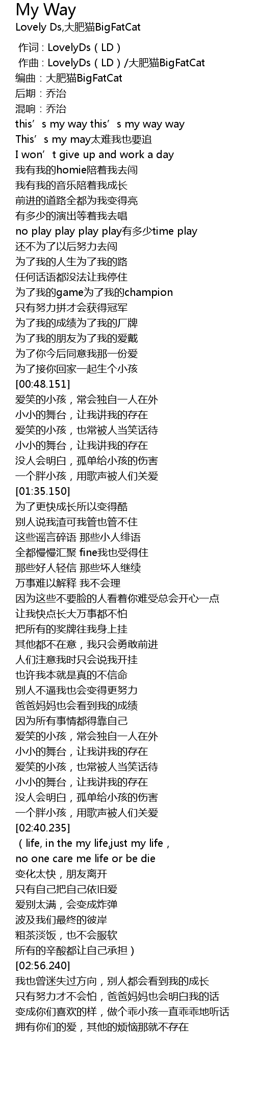 | [00:01.000] | zuò qǔ : LovelyDs LD dà féi māo BigFatCat |