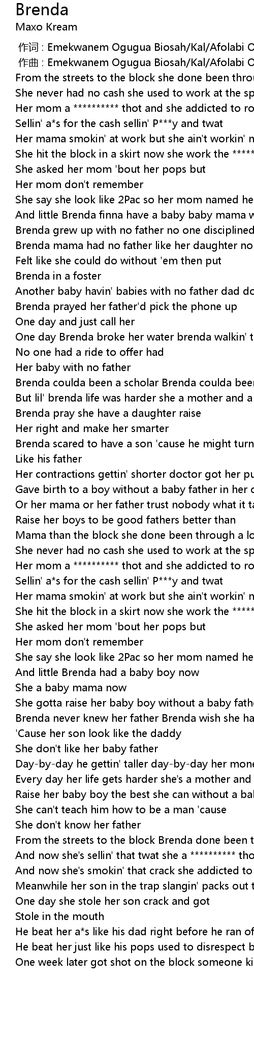 | [00:42.27] | And little Brenda finna have a baby baby mama with no father |