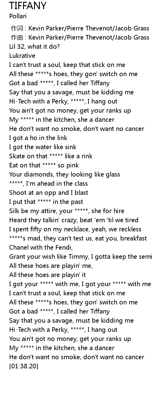| [00:17.47] | Got a bad *****, I called her Tiffany |