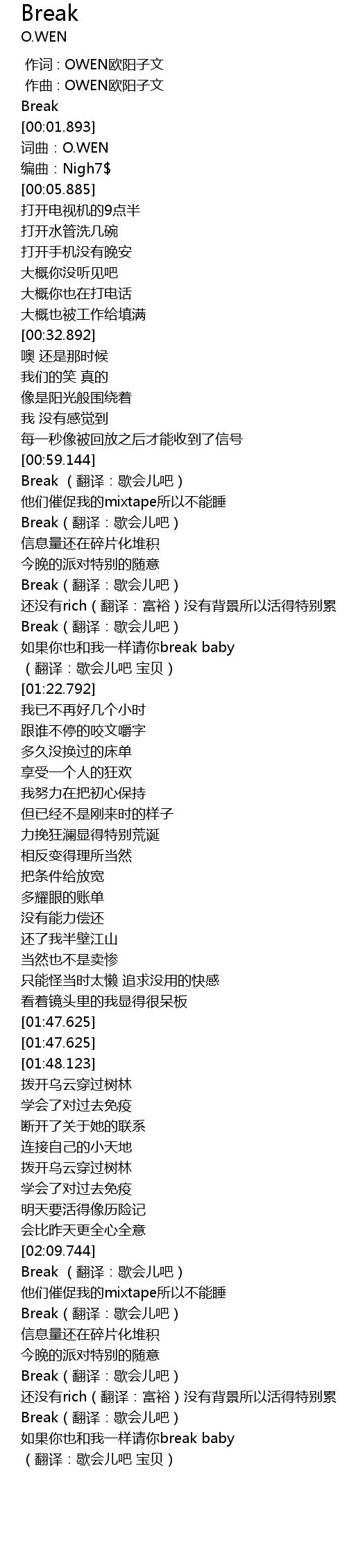 | [01:11.889] | Break(翻译:歇会儿吧) |