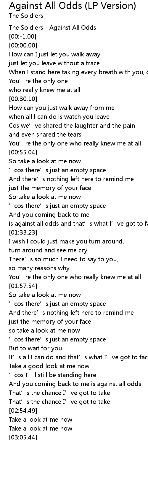 | [01:23.04] | is against all odds and that' s what I' ve got to face |
