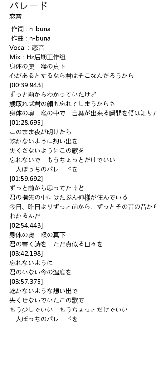 | [04:19.876] | 一人ぼっちのパレードを |