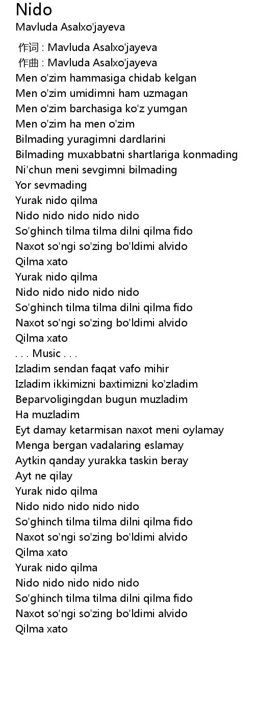 | [00:00.00] | 作词 : Mavluda Asalxo'jayeva |