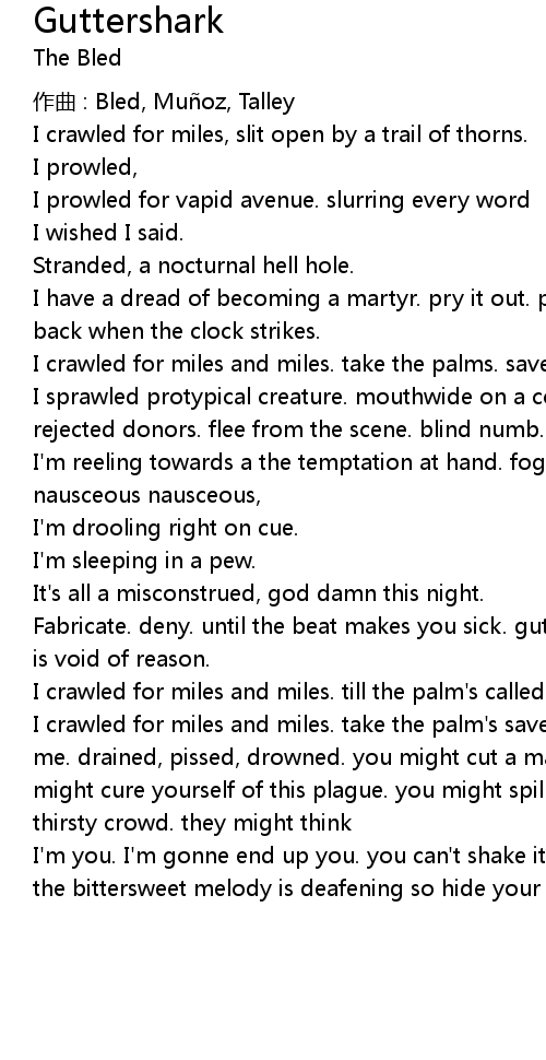 | I crawled for miles and miles. take the palm' s save the fright from... fear grips me. drained, pissed, drowned. you might cut a man just to watch him bleed. you might cure yourself of this plague. you might spill your gut' s to this blood thirsty crowd. they might think | |