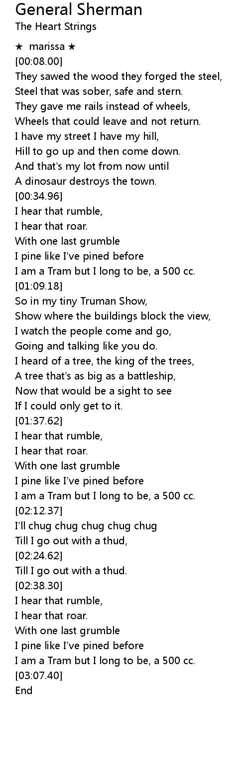 | [03:00.12] | I am a Tram but I long to be, a 500 cc. |