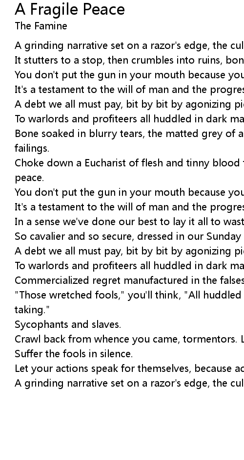 Choke down a Eucharist of flesh and tinny blood to find a fragile, fleeting peace. |