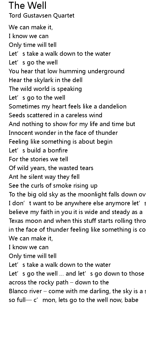 | I don' t want to be anywhere else anymore let' s go to the well you better believe my faith in you it is wide and steady as a | |