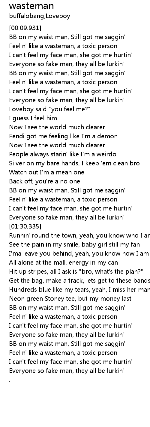 | [00:29.705] | Feelin' like a wasteman, a toxic person |
