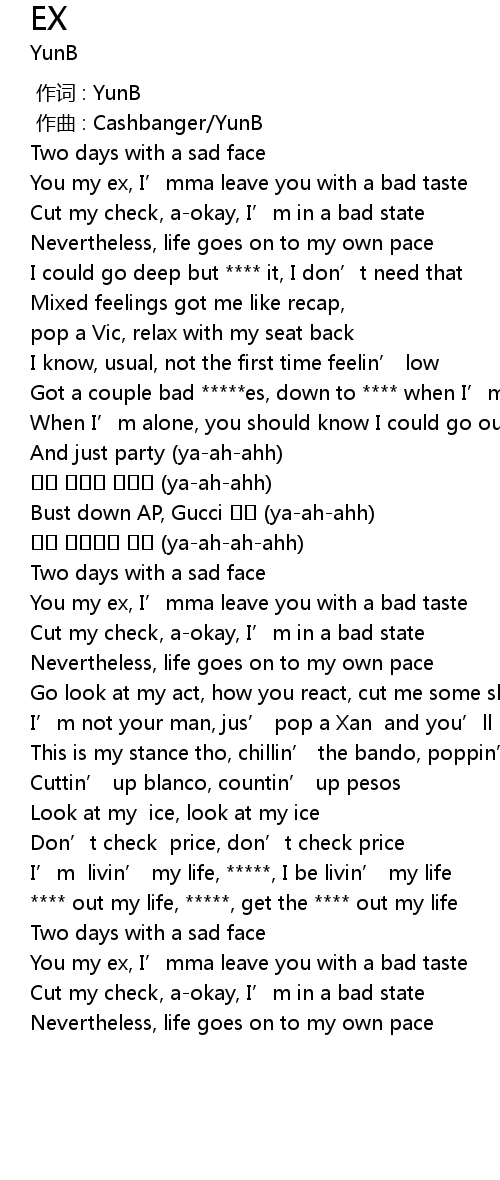 | [00:10.49] | You my ex, I’mma leave you with a bad taste |