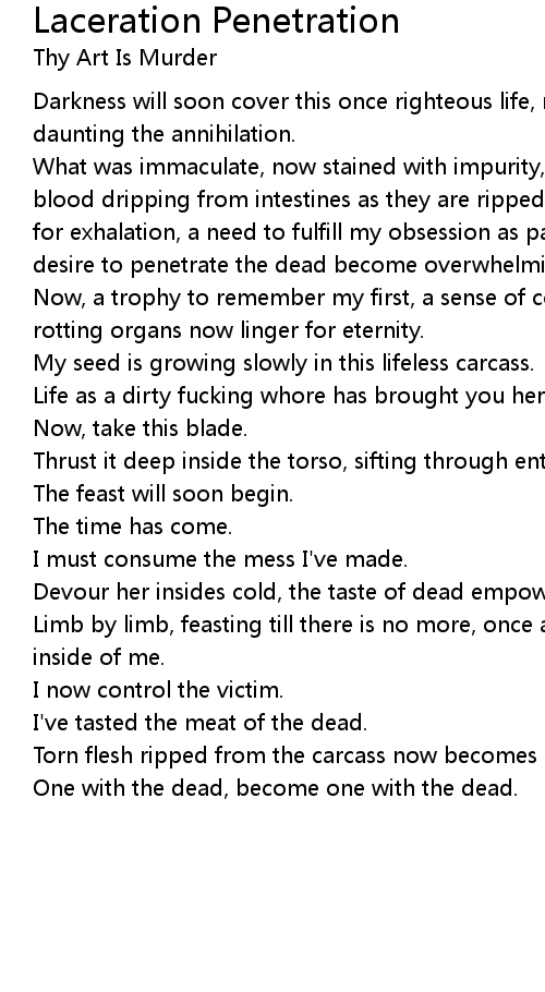 What was immaculate, now stained with impurity, watching this torso turn corpse, blood dripping from intestines as they are ripped from inside out, the struggle for exhalation, a need to fulfill my obsession as pale turns blue, the |