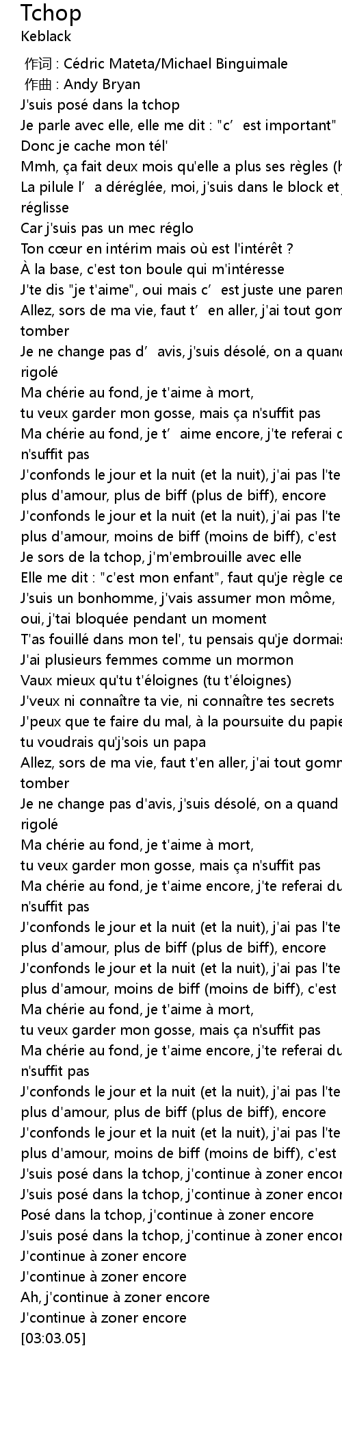 | [02:27.70] | J'suis posé dans la tchop, j'continue à zoner encore |