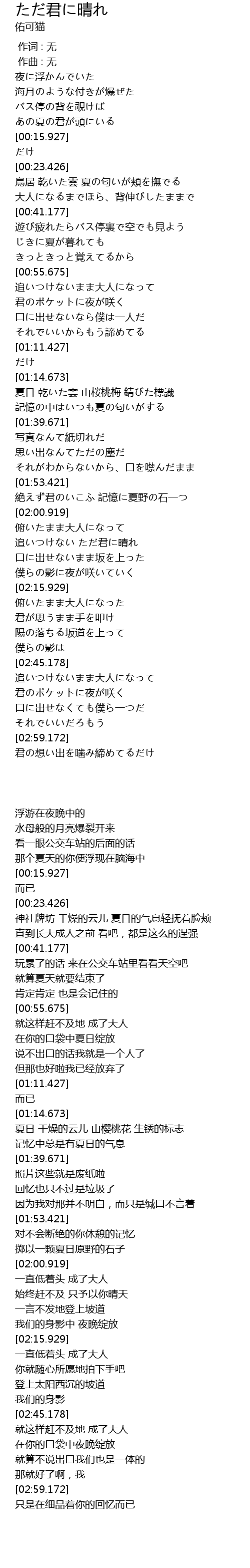 | [02:04.675] | 追いつけない ただ君に晴れ |