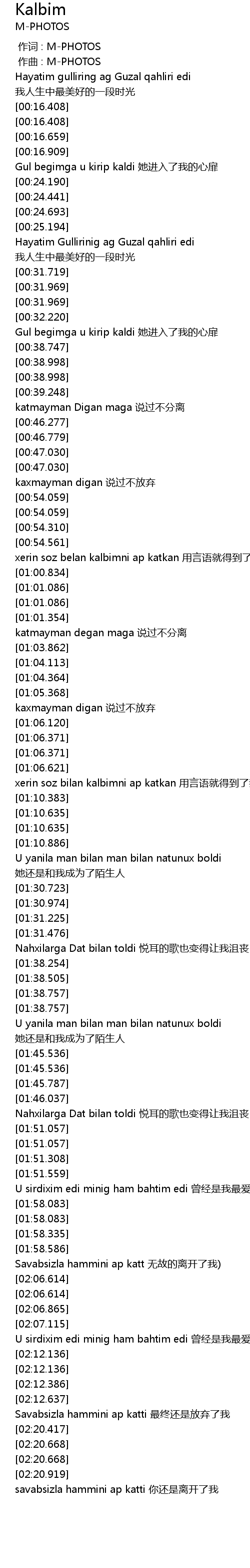 | [02:07.367] | U sirdixim edi minig ham bahtim edi céng jīng shì wǒ zuì ài de rén |