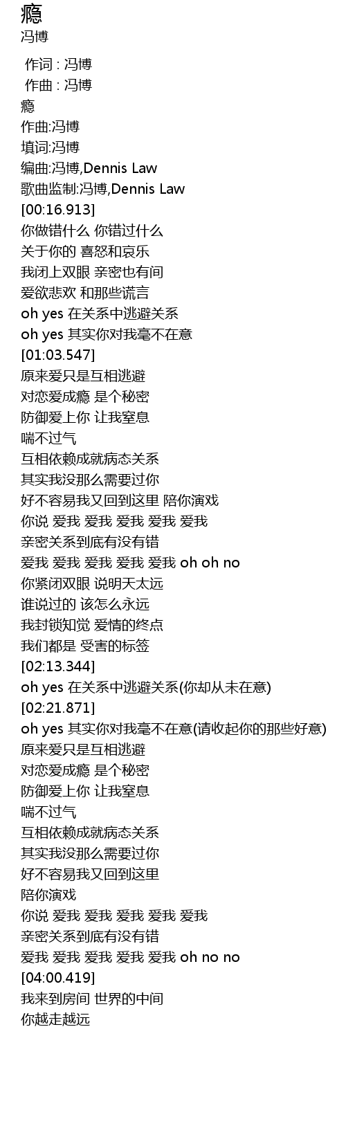 | [00:13.404] | 编曲:冯博,Dennis Law |