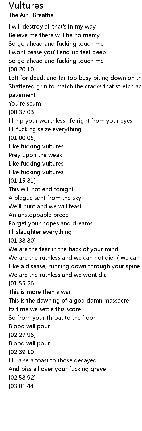 | [00:45.20] | I'll rip your worthless life right from your eyes |