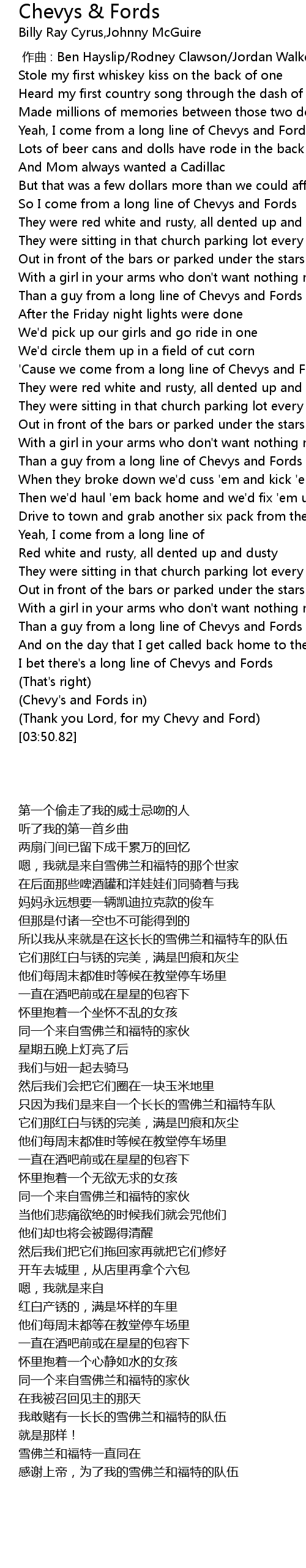 | [00:46.24] | So I come from a long line of Chevys and Fords |