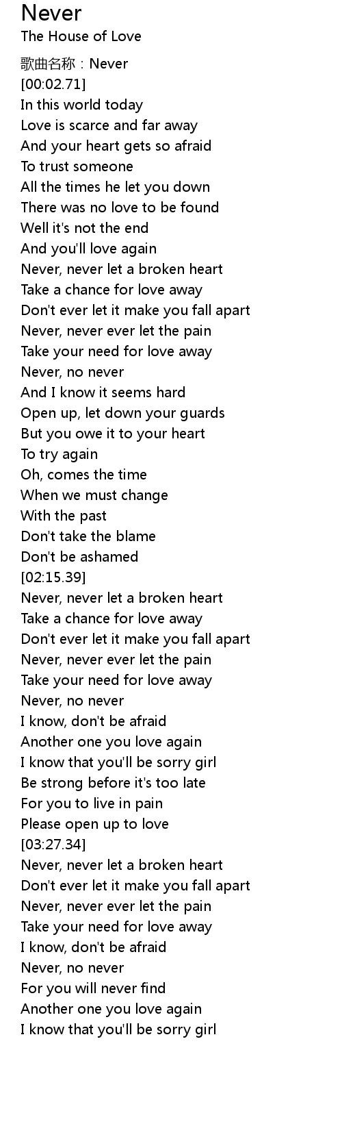 | [03:36.02] | Never, never let a broken heart |