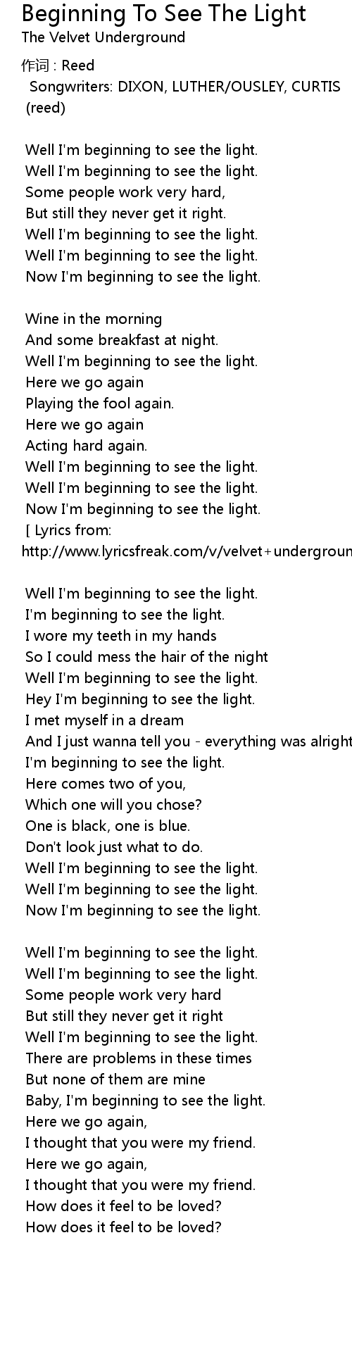 | Lyrics from: http: www. lyricsfreak. com v velvet underground beginning to see the light_20143868. html | |