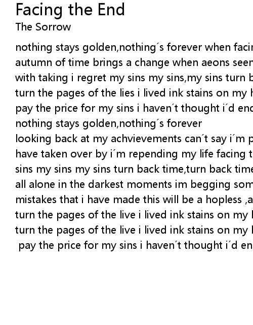 | nothing stays golden, nothing s forever when facing the fall of mortal life the autumn of time brings a change when aeons seem so short in time wasted time only with taking i regret my sins my sins, my sins turn back time turn back time | |