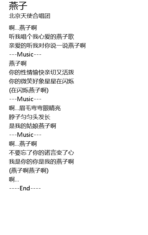 | [00:33.29] | 听我唱个我心爱的燕子歌 |