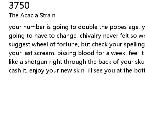 | your number is going to double the popes age. your method of losing weight is going to have to change. chivalry never felt so wrong. your acting needs work. i suggest wheel of fortune, but check your spelling. tonight the world will hear your last scream. pissing blood for a week. feel it in your kidneys. blow a load like a shotgun right through the back of your skull. take that to the bank and cash it. enjoy your new skin. ill see you at the bottom of the barrel. |