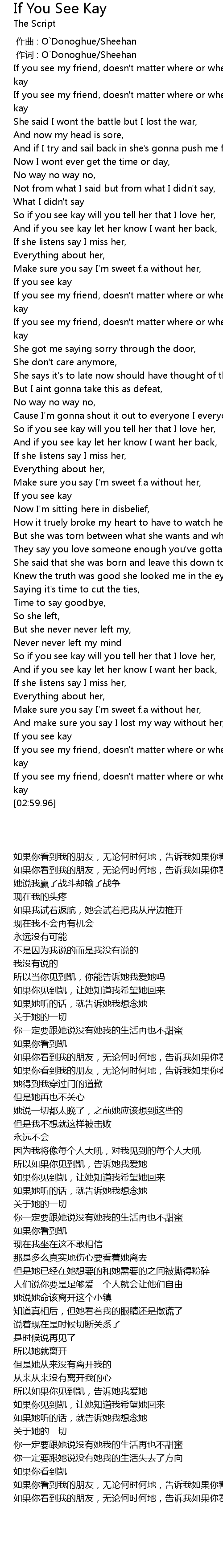 | [02:53.67] | 如果你看到我的朋友,无论何时何地,告诉我如果你看到凯 |