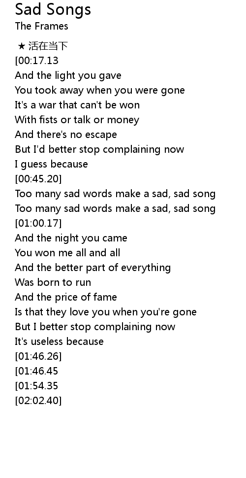 | [02:50.01][01:46.45] | Too many sad words make a sad, sad song |