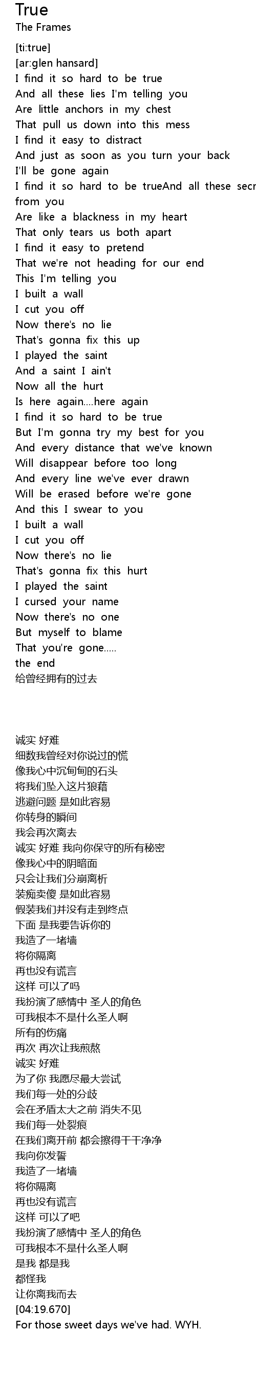 | [01:10.943] | I find it so hard to be trueAnd all these secrets I keep from you |