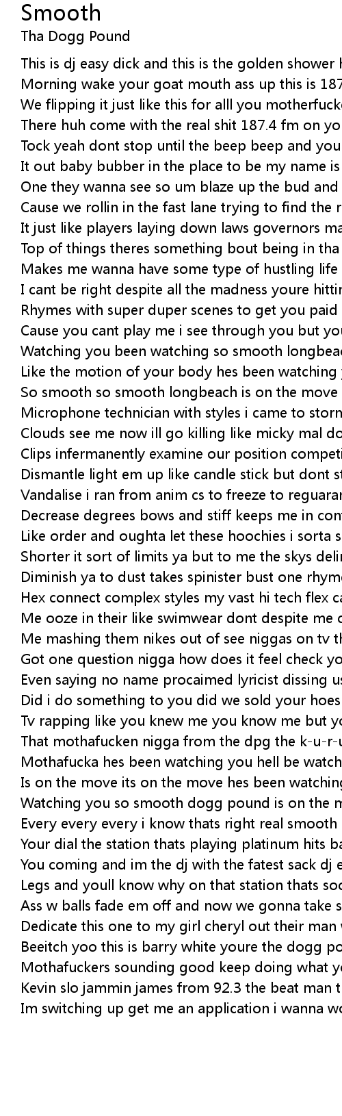 Mothafucka hes been watching you hell be watching so smooth dogg pound |