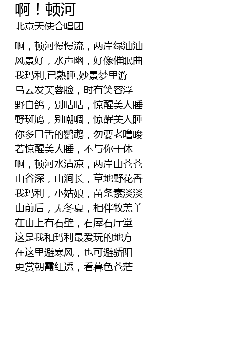 | [02:00.300] | 啊,顿河水清凉,两岸山苍苍 |