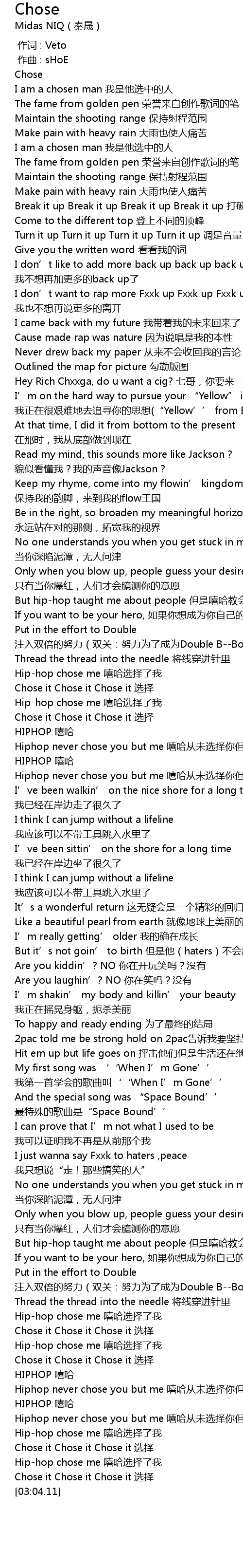 | [02:49.38] | Hiphop never chose you but me 嘻哈从未选择你但是选择了我 |