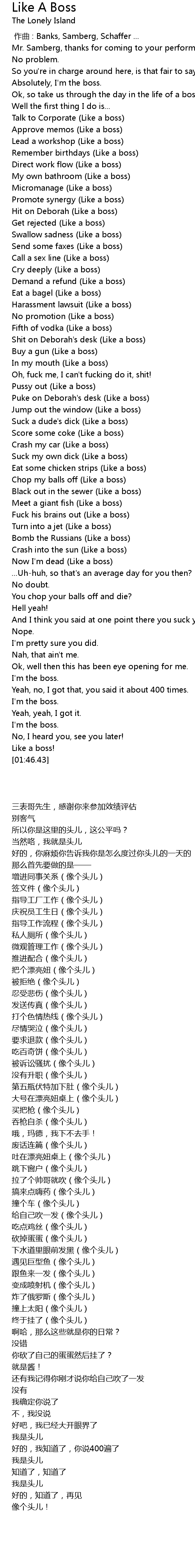 | [00:43.06] | Shit on Deborah' s desk Like a boss |
