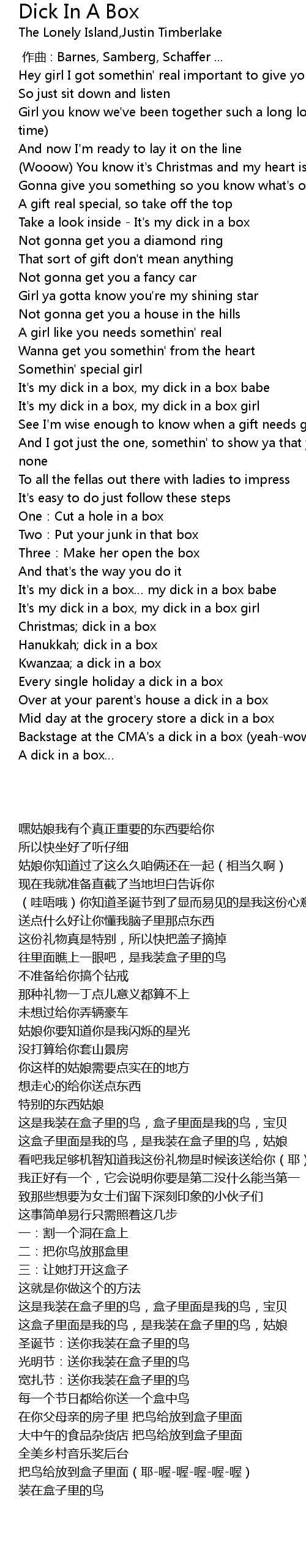 | [01:13.000] | It' s my dick in a box, my dick in a box babe |